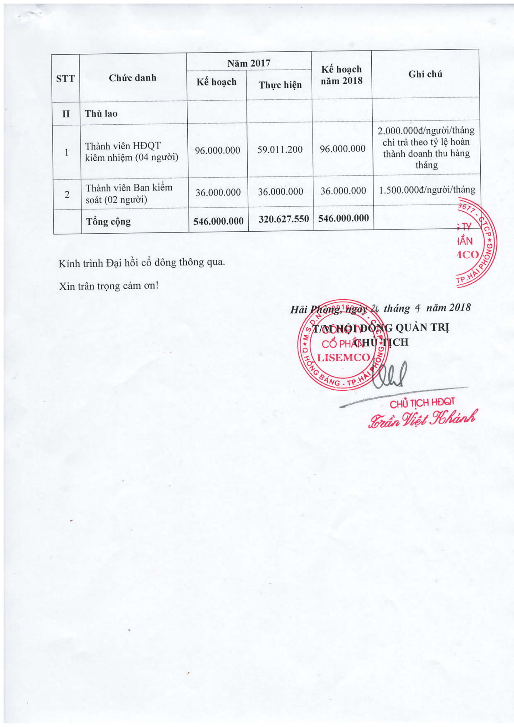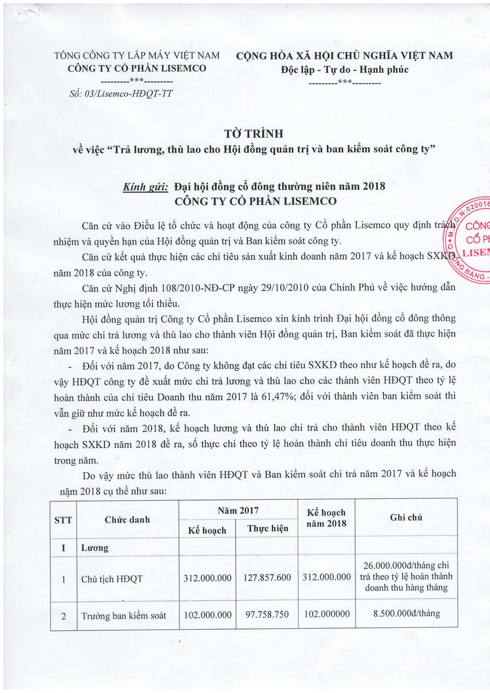 Tờ trình trả lương, thù lao cho HĐQT và ban kiểm soát công ty